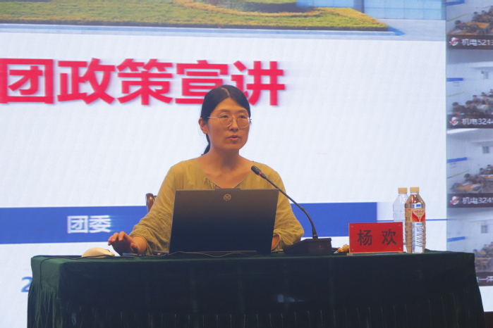 会议第二项由校团委杨欢老师进行共青团政策宣讲。杨老师向同学们详细介绍了共青团的机构设置、组织架构等基本情况。并介绍同学们关心的共青团员发展工作、员工社团情况和社团第二课堂学时、员工会组织情况部门分类及工作要求、品牌二课活动、暑期“三下乡”“返家乡”社会实践活动、老员工志愿服务活动、“挑战杯”竞赛和公司在“挑战杯”取得的荣誉及参加比赛的意义等和同学们在接下来的老员工活中息息相关的共青团任务内容。